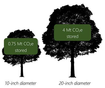 Long-term carbon storage increases substantially with tree size and age. Source: From Kosiba, AM. “What is Forest Carbon?” Vermont Department of Public Health, 2021