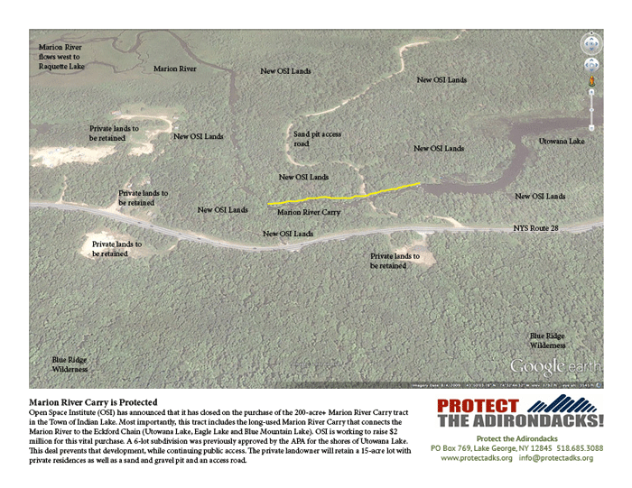 PROTECT salutes the fine work of the Open Space Institute (OSI) to purchase and protect the historic Marion River Carry in the Town of Indian Lake, Hamilton County. OSI purchased over 250 acres on the north side of Route 28 that includes extensive lands on Utowana Lake, the entire .5-mile Marion River Carry, and more than 1.5 miles of the Marion River. This terrific deal is a major accomplishment for two reasons. First, it will ensure in the future that the carry that connects historic canoe routes (Old Forge to Blue Mountain Lake, and Blue Mountain Lake to Saranac Lake) will be maintained and public in perpetuity. Second, a 4-lot subdivision was approved by the Adirondack Park Agency (APA) for the west end of Utowana Lake, near the Carry, and this will now not happen.