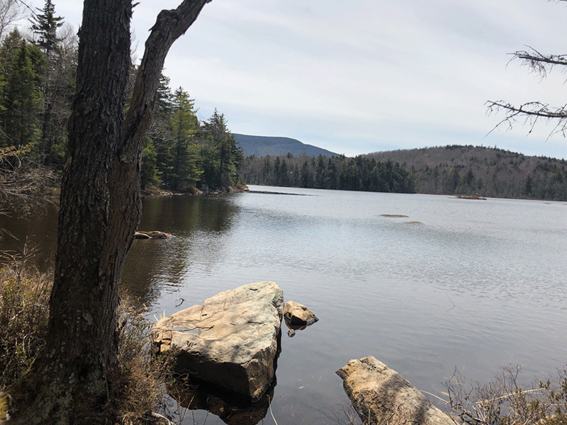 For the next 2.6 miles, the trail is generally level, well-worn and well-marked, with two sustained, gradual climbs. Trail conditions are often wet and eroded. Here and there are particularly massive yellow birch and black cherry. Glacial erratics stand along the trail side. 2.6 miles from the trailhead register the trail reaches a junction. At the trail junction, Stephen’s Pond is 0.6 miles to the south and Cascade Pond is 1 mile to the north. There is one lean-to on each pond, which are easy to miss and walk past.
