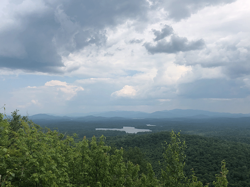 After the first summit, the trail dips through a small valley, which ends at the second summit’s protruding bedrock. Scramble up the side of this bedrock to reach the summit. From the top of Floodwood Mountain there is a good view to the west of Wolf Pond and rolling hills in the Forest Preserve and conservation easements lands.