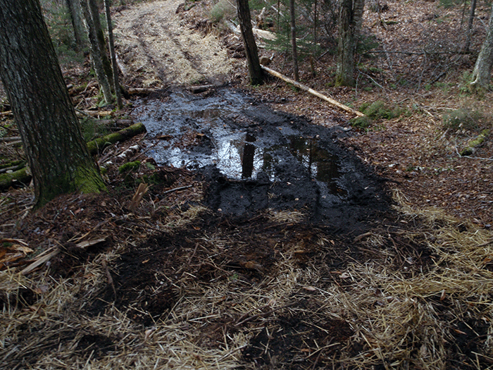 A section of the new class II community connector snowmobile trail around Harris Lake where the trail surface has been severely damaged through grading.