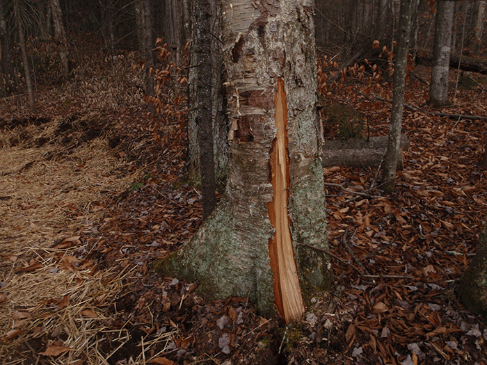 Damage to a tree along the corridor on the new class II community connector snowmobile trail around Harris Lake. This tree is unlikely to survive.