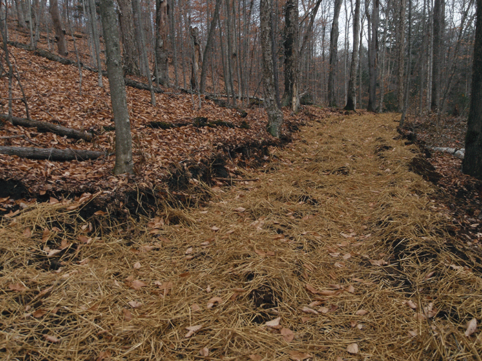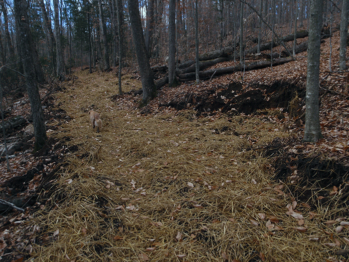 The new class II community connector snowmobile trail around Harris Lake includes many hundreds of yards of “bench cuts” dug into the hillsides to create a flat trail. There is nothing like this on a foot trail. The straw has been placed on the trail to stabilize against erosion after the extensive grading with heavy machinery.